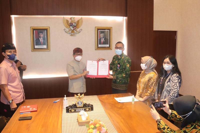 Bali Tribune/ TIM PENILAI - Sekda Wayan Adi Arnawa menandatangani berita acara Sistem Merit dengan Tim Penilai Penerapan Sistem Merit di Bali Lian Ifandi di Puspem Badung, Kamis (7/10/2021).