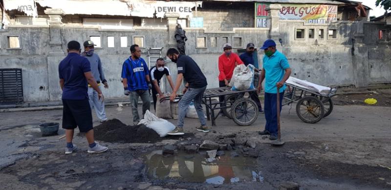 Bali Tribune/ KOMPAK - Petugas parkir Pasar Galiran kompak gotong royong menambal jalan di kawasan pasar.