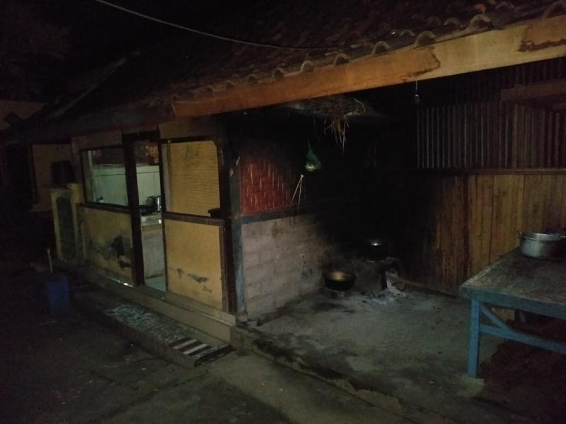 Bali Tribune/DAPUR – Kondisi dapur yang terdapat tungku kayu bakar api menyambar selang tabung gas yang bocor.