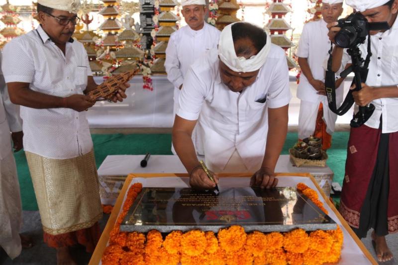 Bali Tribune/ TANDATANGNI - Bupati I Made Gianyar tandatangani prasasti GGS di wantilan Pura Penataran Agung Desa Adat Sidembunut.