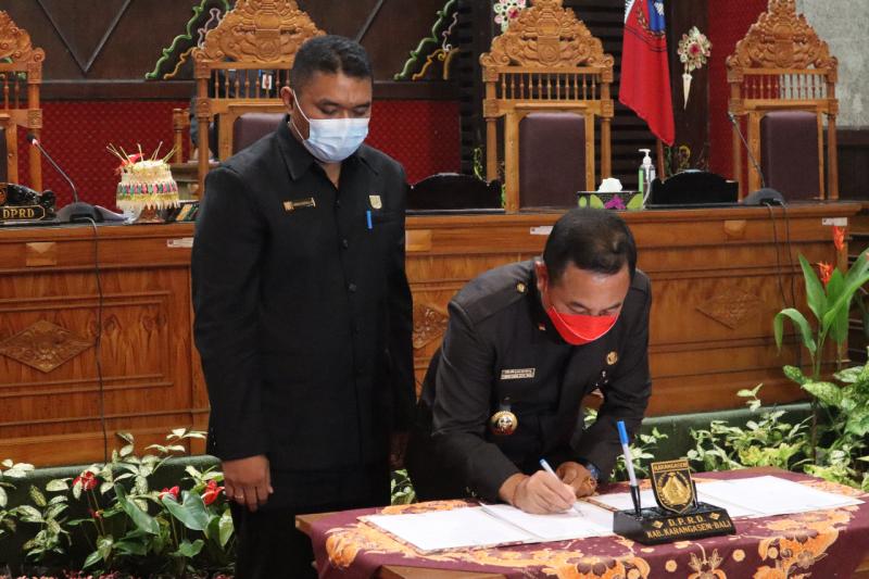 Bali Tribune/ PENANDATANGANAN - Nota kesepakatan KUA PPAS Tahun Anggaran 2022 oleh Bupati Karangasem dan Ketua DPRD Karangasem.