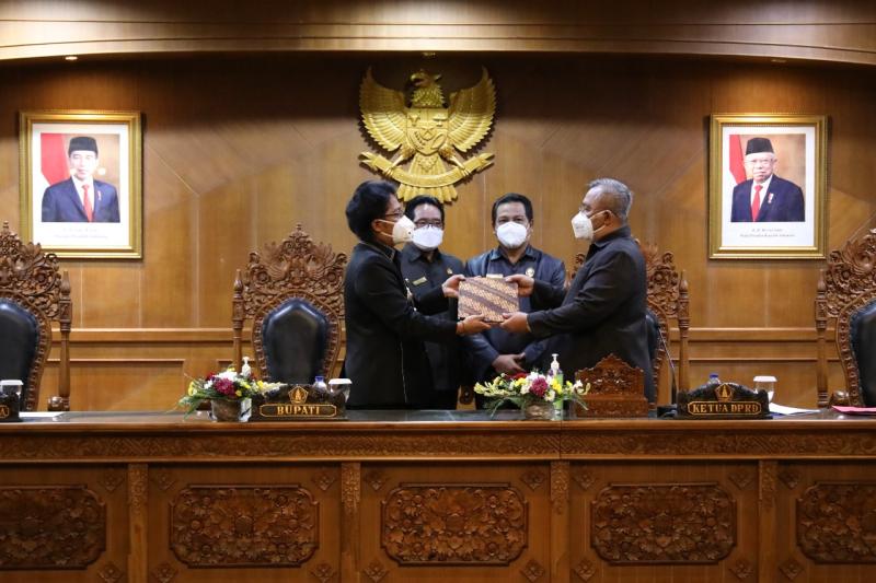 Serta rancangan peraturan daerah Kabupaten Badung tentang rencana pembangunan jangka menengah daerah semesta berencana Kabupaten Badung tahun 2021-2026. Sidang yang berlangsung di ruang Utama Gosana kantor DPRD Badung, Senin (5/7) tersebut, dilaksanakan secara virtual dipimpin oleh Ketua DPRD Badung Putu Parwata bersama Wakil Ketua 1 Wayan Suyasa dan Wakil Ketua 2 Made Sunarta.