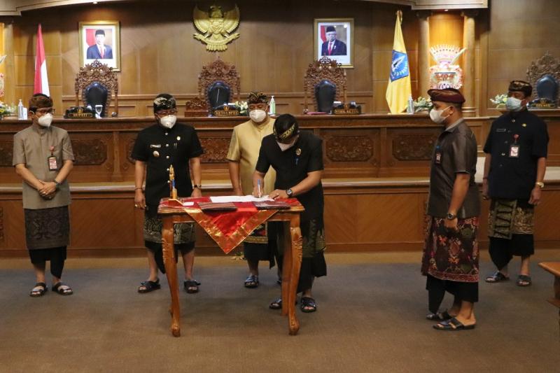 balitribune.co.id | Mangupura  - Setelah melalui beberapa tahapan Sidang Paripurna Dewan serta Rapat Kerja antara Dewan dan Pemerintah Daerah. Dalam masa Sidang Paripurna kedua DPRD Badung, Kamis (15/7), Bupati Badung Nyoman Giri Prasta bersama-sama pimpinan DPRD Kabupaten Badung menandatangani persetujuan bersama atas 2 (dua) Rancangan Peraturan Daerah (Ranperda). Keduanya yakni Ranperda Kabupaten Badung tentang Pertanggungjawaban Pelaksanaan APBD Kabupaten Badung Tahun Anggaran 2020 dan Ranperda Kabupaten Badung tentang Rencana Pembangunan Jangka Menengah Daerah (RPJMD) Semesta Berencana Kabupaten Badung tahun 2021-2026.