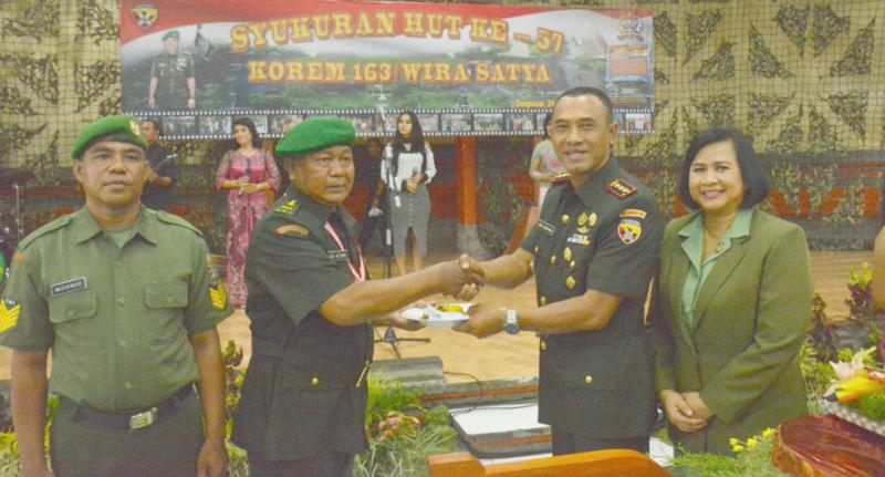 KOREM – Didampingi sang istri tercinta, Danrem 163/Wira Satya Kolonel Arh I Gede Widiyana, SH., menyerahkan potongan tumpeng syukuran HUT ke-57 Korem 163/Wira Satya kepada Babinsa Terbadik, Pelda I Kadek Astawa, Sabtu (24/2).