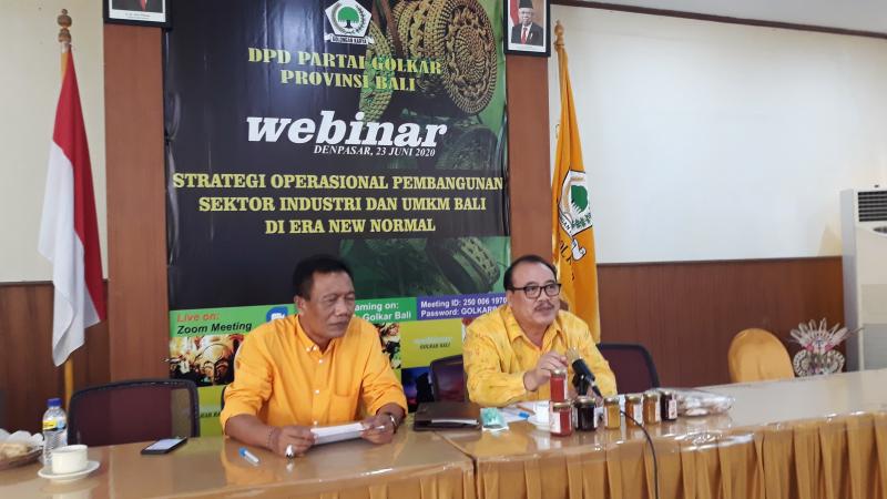 balitribune.co.id | Denpasar – Upaya menggali kontribusi pemikiran, gagasan dari para akademisi, praktisi dan stakeholder lainnya untuk mewujudkan keseimbangan ekonomi baru bagi Bali di era New Normal (Normal Baru). DPD Partai Golkar Provinsi Bali menggelar Webinar "Strategi Operasional Pembangunan Sektor Industri dan UMKM Bali di Era New Normal" Selasa (23/6) di Kantor DPD Partai Golkar Provinsi Bali. Webinar kali ini dimoderatori Wakil Ketua Bidang Pemenangan Pemilu DPD Partai Golkar Provinsi Bali sekaligus Ketua Panitia Dr. Komang Suarsana.