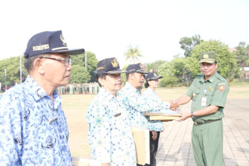 SERAHKAN - Usai apel Pjs Bupati Sugiada serahkan penghargaan kepada PNS Klungkung yang pensiun.