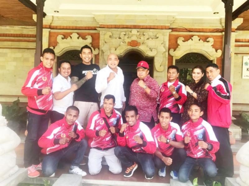 GUBERNUR CUP - Ketum KONI Denpasar IB Toni Astawa dan Ketua Pertina Denpasar Made Muliawan berpose bersama petinju dan pelatih yang akan dikirim ke Gubernur Cup NTB.