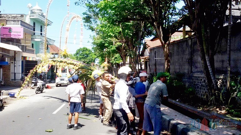Niat ikut berpartisipasi dalam rangka menyambut HUT Puputan Klungkung ke 108 dan HUT ke 24 Kota Semarapura, siswa SMP Dhramayasa, Timuhun, Banjarangkan, Klungkung saat memasang penjor di jalan Puputan, Semarapura, Klungkung nyaris kesetrum.