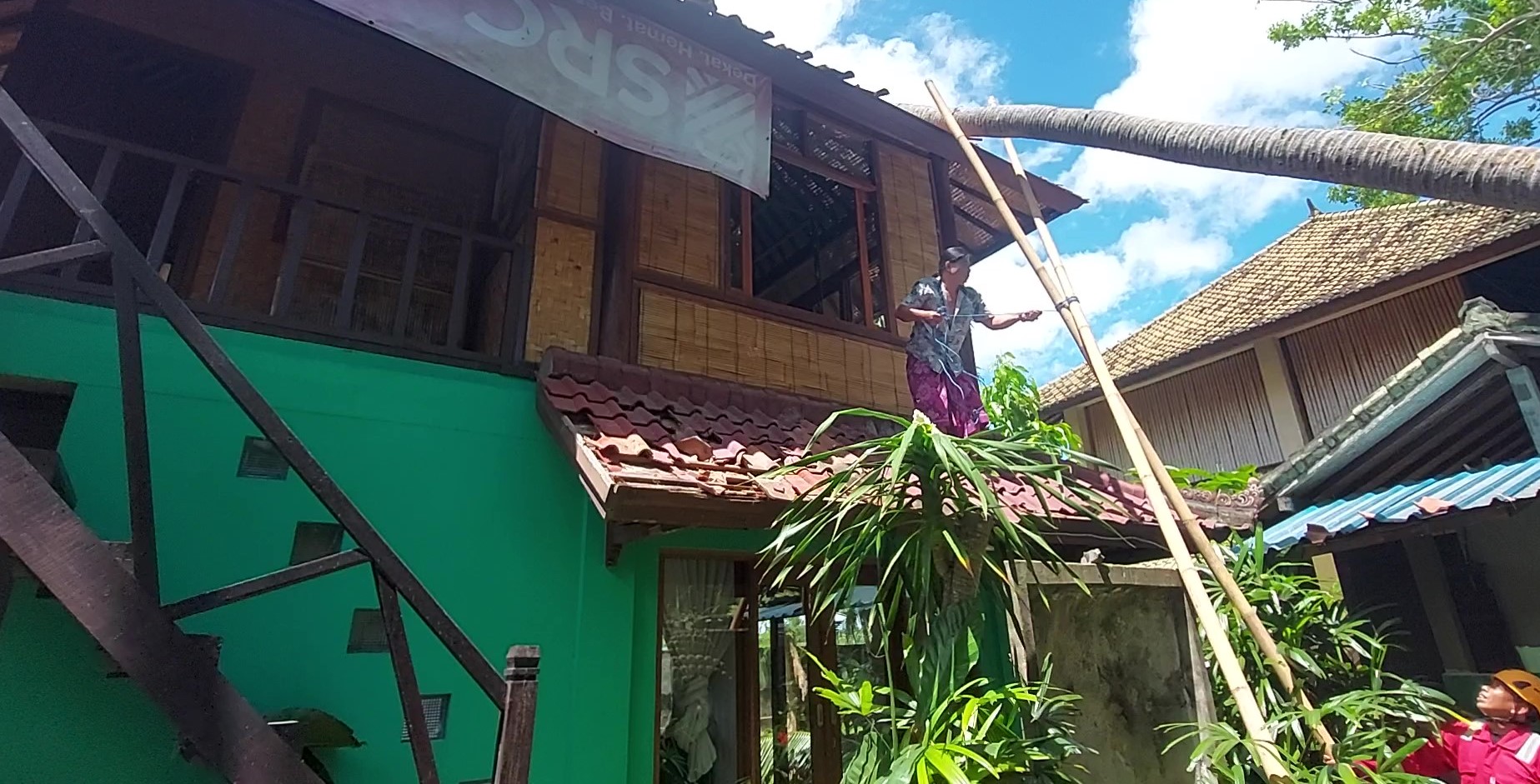 Di Banjar Dinas Jasri Kelod, Desa Kasri, Kelurahan Subagan, Karangasem, pohon kelapa setinggi 25 meter tumbang dan menghantam rumah kayu dua lantai milik Ni Komang Sukerti, warga setempat, pada Kamis (5/1/2023) siang. Kerasnya hantaman batang kayu pohon kelapa tersebut sampai membuat sebagian atap rumah semi villa tersebut rusak parah.