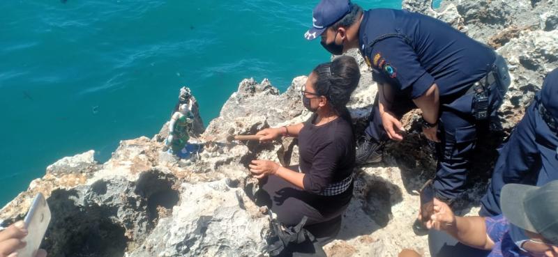 balitribune.co.id | Denpasar - Terjawab sudah siapa yang pemasang patung Nyi Roro Kidul di atas batu karang di area kawasan Pantai Waterblow, ITDC, Nusa Dua. Dia adalah Made Tutik Remaja alias Jro Dalem Samudra (45), warga Jalan Gatot Subroto IV Blok XI Ujung, Banjar Lingkungan Umasari Kelurahan Dangin Puri Kaja, Kecamatan Denpasar Utara. Patung Nyi Roro Kidul tersebut juga telah dibongkar Selasa kemarin pukul 12.35 Wita. Di hadapan Kapolsek Kuta Selatan AKP Yusak Sooai dan pihak ITDC, Selasa (26/5) siang, Made Tutik Remaja mengakui bahwa dirinya yang memasang patung tersebut atas pewisik (bisikan) yang ia dapat ketika melakukan meditasi di Pura Rong Telu miliknya pada 6 Mei 2020. Diakuinya bahwa bisikan tersebut ia diharuskan untuk ngiring dan juga harus memasang patung Nyi Roro Kidul di Pantai Waterblow, karena pantai tersebut merupakan pantai perbatasan pantai selatan di Bali. Sehingga pada tanggal 9 Mei 2020 pukul 17.00 Wita, ia datang ke lokasi bersama dengan I Ketut Widana yang merupakan calon suaminya. "Saya memohon maaf sebesar-besarnya kepada Kapolsek Kuta Selatan dan khususnya pihak ITDC yang sudah dirugikan. Saya mengakui bahwa yang memasang patung tersebut. Saya sangat menyesal karena perbuatan saya tersebut menjadi viral di masyarakat dengan banyaknya pendapat yang berbeda-beda," ungkapnya. Meski demikian, ia mengakui bahwa bukan dirinya yang memposting di youtube tetapi calon suaminya Ketut Widana. "Karena dia dendam dan kepingin menghancurkan saya. Ada bahasa percakapan di WA, dia berkata akan menghancurkan saya dan tunggu tanggal mainnya," tuturnya. Terkait dengan adanya video kesurupan tersebut, ia juga menjelaskan bahwa itu bukan dirinya. "Saya heran kenapa dikaitkan dengan saya walaupun celana yang dipakai sama persis. Sekali lagi atas pribadi saya meminta maaf dengan apa yang saya lakukan dan saya tidak akan mengulanginya serta akan mencabut patung tersebut," ujarnya. Kapolsek Kuta Selatan, AKP Yusak Sooai menanyakan, apa dasarnya memasang patung yang menyerupai Nyi Roro Kidul tersebut di area Pantai Waterblow. "Tolong nanti Ibu klarifikasi. Nanti Humas agar memvideokan permintaan maaf yang bersangkutan dan meng-share ke akun-akun yang viral memberitakan peristiwa tersebut. Sehingga masyarakat mengetahui sebenarnya dan tidak kembali menimbulkan opini-opini tentang kemunculan patung tersebut," kata Kapolek Kuta Selatan, AKP Yusak Sebagaimana diketahui, sebuah patung menyerupai sosok Nyi Roro Kidul membuat heboh masyarakat dan viral di media sosial. Patung itu, ditemukan di Pantai Water Blow, Kawasan ITDC, Nusa Dua, Badung, Bali, Minggu (24/5) kemarin, sekitar pukul 16.00 Wita. Patung tersebut yang berada di atas batu karang seperti patung Nyi Roro Kidul (Ratu Pantai Selatan) berwarna hijau dengan ukuran sekitar 30 sentimeter," kata Kapolsek Kuta Selatan, AKP Yusak Agustinus, sebagaimana dilansir merdeka.com, Senin (25/5). Penemuan patung itu, berawal dari tiga orang security kawasan bersama Babinsa Kelurahan Benoa melaksanakan patroli di area Pantai Water Blow. Mereka sekaligus mengecek keberadaan korban peristiwa jukung terbalik. Kemudian, sambil memantau keberadaan korban secara tidak sengaja salah satu petugas keamanan melihat adanya salah satu benda yang berada di atas batu karang. Selanjutnya, setelah dilakukan pengecekan dengan kamera dan di zoom. Dipastikan, bahwa benda itu merupakan sebuah patung dengan ciri-ciri berwujud Nyi Roro Kidul.