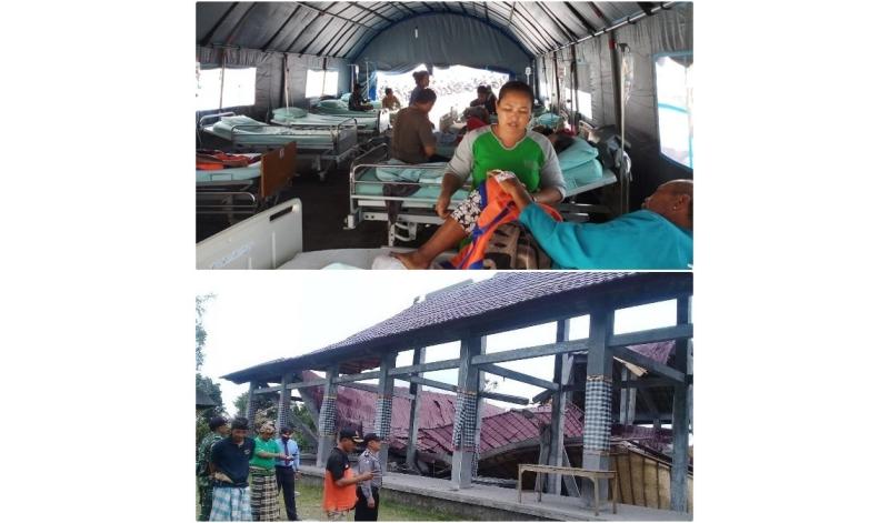 BALI TRIBUNE - Gempa berkekuatan 7 SR yang mengguncang Lombok Timur pada Minggu (19/8) malam, sampai saat ini masih menyisakan trauma tidak hanya bagi masyarakat di Lombok, NTB, namun sebagian besar masyarakat di Karangasem. Bagaimana tidak, guncangan gempa yang membuat tanah di areal Pelabuhan Kayangan Lombok Timur itu terbelah tersebut, juga sangat kuat dirasakan masyarakat di Karangasem. Sebagaian besar masyarakat di Karangasem memilih tidur di luar rumah pada Minggu malam tersebut karena guncangan gempa susulan masih terjadi, dan bahkan pada Senin (20/8), gempa susulan masih terjadi hingga sore. Hingga kemarin pihak BPBD Karangasem masih melakukan pendataan kerusakan akibat guncangan gempat Lombok, namun dari laporan yang diterima koran ini, tembok penyengker Puri Gede Karangasem yang terbuat dari tatal atau kepalan tanah ambruk. Selain itu, gapura di pintu masuk objek wisata Taman Sukasadha Ujung, Karangasem juga ambruk bagian atasnya. Guncangan gempa juga membuat pasien di RSUD Karangasem panik. Untuk menghilangkan trauma dan demi kenyamanan serta keamanan pasien, RSUD Karangasem memindahkan seluruh pasien ke dua tenda besar yang didirikan BPBD Karangasem. Selain di dua tenda tersebut, sebagian pasien juga dirawat di selasar rumah sakit. Saat malam hari, tenda yang didirikan oleh BPBD tersebut memang sangat nyaman bagi pasien. Selain hangat hawa atau udara segar juga bisa dirawakan oleh pasien sehingga pasien merasa nyaman. Namun masalah baru muncul saat siang hari utamanya saat tenda terkena terik matahari. Hawa di dalam ruangan tenda terasa panas serta ruang tenda menjadi pengap. “Kalau malam di dalam tenda cukup nyaman dan aman. Cuman pada siang hari, di dalam itu pengap dan agak panas,” ungkap I Wayan Sudiarta, salah satu penunggu pasien asal Desa Aantiha, Kecamatan Manggis, kepada koran ini kemarin. Kendati demikian ada sejumlah pasien yang memilih bertahan di dalam ruangan tenda saat siang hari, namun sebagian lainnya memilih keluar tenda untuk mencari udara segar. Humas RSUD Karangasem, I Gede Dedy Arto, kepada wartawan menyebutkan, saat ini memang baru terpasang dua tenda BPBD dan untuk mengkaver seluruh pasien yang ada, pihaknya sudah mengusulkan satu tenda lagi dan saat ini tengah didirikan oleh BPBD. “Satu tenda lagi yang didirikan itu untuk evakuasi pasien di UGD jika terjadi gempa lagi,” sebutnya. Kerugian Rp 1,2 M Sementara di Bangli, gempa 7 SR di Lombok Timur (NTB), Minggu (19/8) malam mengakibatkan rusaknya beberapa fasilitas umum dan rumah penduduk di Bangli. Kuatnya guncangan, mengakibatkan wantilan Pura Dalem Desa Bunutin, Kintamani dan Bale Daje milki I Nyoman Lemuh warga Dusun Gaga Desa Tamnbali, hancur. Perbekel Desa Bunutin, I Made Subrata saat dikonfirmasi kemarin mengatakan, wantilan yang roboh dibangun dua tahun lalu dengan menelan anggaran Rp1,2 miliar. Menurut adik dari Bupati I Made Gianyar ini, sejatinya kerusakan struktur wantilan sudah terlihat ketika gempa yang terjadi sebelumnya (Minggu, 5/8) lalu.” Guncangan gempa yang terjadi dua pekan lalu menyebabkan beberapa bagian bangunan retak,” ujarnya. Subrata mengatakan, guncangan gempa yang terjadi Minggu (19/8) pukul 21.56 Wita memang terasa cukup keras dan menyebabkan bangunan wantilan Pura Dalem Bunutin ambruk. Pascaambruk, pihaknya sudah melakukan koordinasi dengan BPBD Bangli. “Untuk proses evakuasi material bangunan membutuhkan bantuan alat berat,“ ungkapnya. Kepala Pelaksana Badan Penanggulangan Bencana Daerah (BPBD) Bangli, I Wayan Karmawan mengatakan gempa di Lombok Timur beberapa kali membawa dampak kejadian yang tersebar di tiga kecamatan di Bangli.