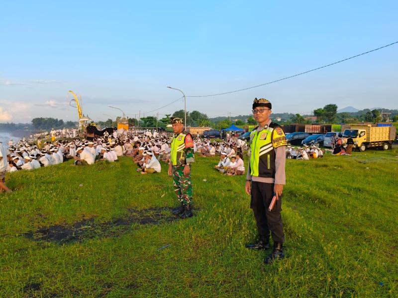 balitribune.co.id I Gianyar - Sejumlah pantai di Gianyar menjadi tempat prosesi Pamelastian serangakaian Hari Raya Nyepi Tahun Baru Caka 1948, Senin (16/3/2026). Petugas kepolisian pun bersinergi dengan TNI dan  Pecalang untuk memastikan kelancaran upacara tersebut.