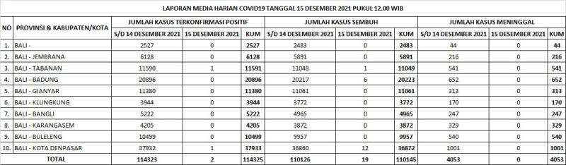Bali Tribune/ Update Covid-19 di Bali, Rabu 15 Desember 2021.