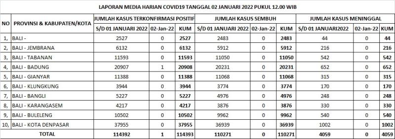 Sehingga dapatlah dirinci selama pandemi tercatat ada 4.059 orang meninggal akibat Covid-19 di Bali. Jumlah kasus secara kumulatif se Bali, untuk Positif ada 114.393 orang. Pasien sembuh selama pandemi, dicapai sebanyak 110.271 orang.