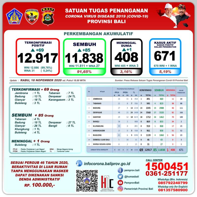 Jumlah kasus secara kumulatif se Bali, untuk Positif ada 12.917 orang. Untuk pasien sembuh ada 11.838 orang (91,65%), dan yang meninggal ada 408 orang (3,16%). Kasus aktif dalam penanganan atau perawatan medis sampai saat ini ada 671 orang (5,19%).