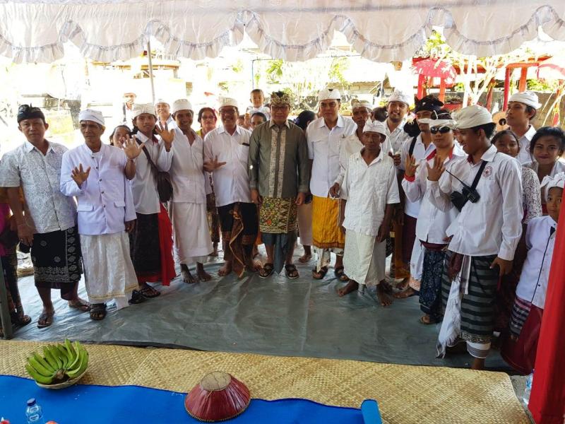 BALI TRIBUNE - Wakil Bupati Badung Ketut Suiasa hadir dan ikut berbaur melakukan persembahyangan saat Piodalan Di Pura Dadia Pande Jimbaran bersama 16 KK pengempon Pura Dadia Pande Jimbaran,bertepatan dengan Tumpek Landep Sabtu (27/10) yang lalu . Hadir dalam kesempatan tersebut Camat Kuta Selatan Made Widiana, Lurah Jimbaran Ketut Rimbawan, Ketua dadia Pande Jimbaran Wayan Tablung serta tokoh masyarakat setempat. Ketua dadia Pande Jimbaran Wayan Tablung menyampaikan ucapan terimakasih atas kehadiran Wakil Bupati Badung ikut berbaur dengan keluarga besar Pande di Jimbaran. "Kami atas nama warga Pande Jimbaran mengucapkan terimakasih atas kehadiran Bapak wakil ditengah-tengah Warga kami. Kami ingin memperkenalkan warga kami kepada Bapak dan siap untuk mendukug program-program pemerintah," ungkapnya. Sementara itu Wakil Bupati Badung memberikan apresiasi atas semangat gotong royong warga Pande Jimbaran yang sudah mampu membangun pura dadia. "Semangat ini kami apresiasi dan kami Pemerintah Kabupaten Badung akan senantiasa hadir ditengah-tengah masyarakat. Untuk itu kami akan siap membantu kelanjutan pembangunan Pura Dadia ini sesuai prosedur dan peraturan," Pungkas Suiasa. Untuk memotivasi Warga Pande Jimbaran, Wakil Bupati Badung Ketut Suiasa juga menyerahkan punia yang diterima langsung Ketua dadia Pande Jimbaran Wayan Tablung.