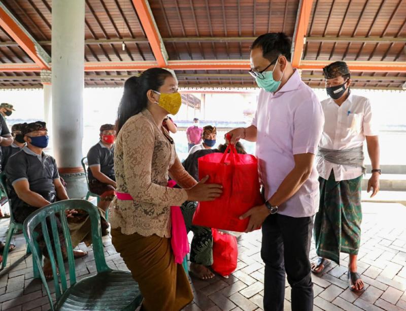 Balitribune.co.id | Mangupura - Untuk meringankan beban masyarakat dalam masa pademi Covid-19, Wakil Bupati Badung I Ketut Suiasa terus bergerak di tengah masyarakat. Kali ini Kamis (27/8) bertempat di Wantilan Pura Dalem Desa Adat Mengwi, Suiasa mendistribusikan 16 paket bantuan sembako untuk meringankan beban masyarakat yang melakukan isolasi mandiri akibat salah satu anggota keluarganya terpapar virus Corona.