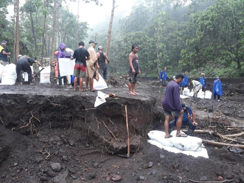 GOTONG ROYONG – Warga Banjar Apad Sari tampak bergotong royong memperbaiki jalan darurat yang rusak diterjang banjir.