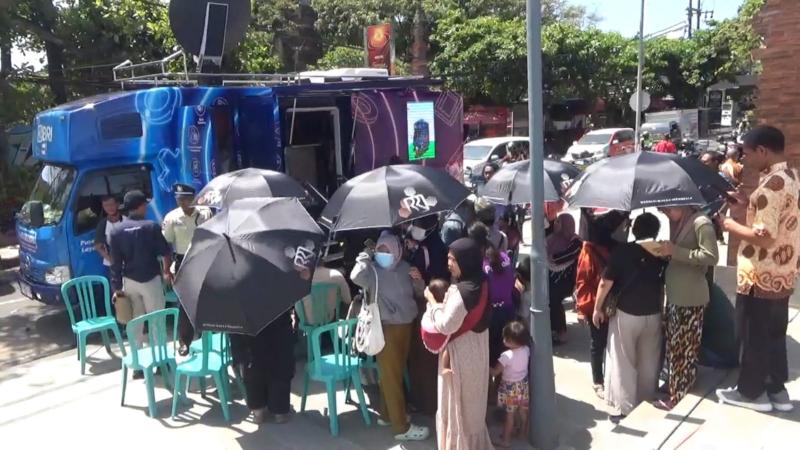 balitribune.co.id | Badung - Menjelang Lebaran, masyarakat mulai mendatangi lokasi penukaran uang pecahan baru di mobil keliling layanan penukaran uang. Seperti terpantau di Pantai Kuta, Badung, Selasa (26/3) pagi, masyarakat rela mengantre untuk menukar uang di mobil kas keliling.