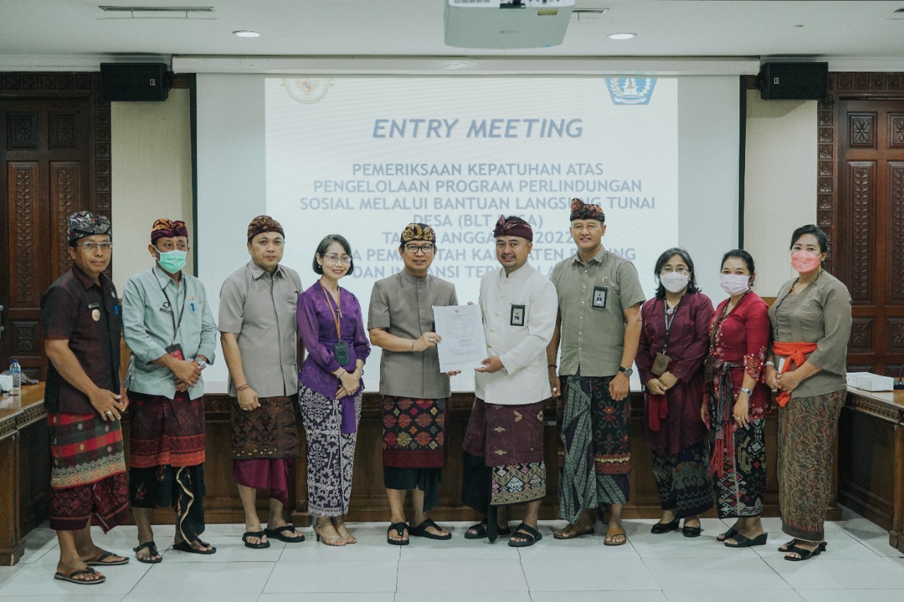balitribune.co.id | Mangupura - Bupati Badung diwakili Sekda Badung I Wayan Adi Arnawa menerima Entry Meeting Tim Badan Pemeriksa Keuangan (BPK) Republik Indonesia Perwakilan Provinsi Bali untuk melakukan pemeriksaan rinci terhadap kepatuhan atas pengelolaan program perlindungan sosial melalui Bantuan Langsung Tunai (BLT) Desa tahun anggaran 2022 pada Pemerintah Kabupaten Badung dan Instansi