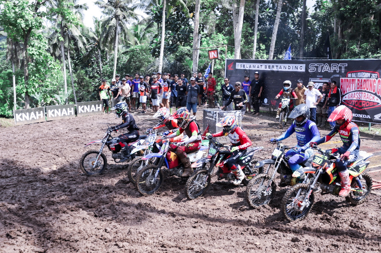 balitribune.co.id | Mangupura - Lomba Balap Sepeda Motor IMI Bali Road Show Bupati Badung Cup Grasstrack Motocross 2022 digelar di Sirkuit Blahkiuh Riding Park, Minggu (2/10). Lomba diikuti 75 peserta (21 kelas), juga diikuti peserta usia 10 tahun menggunakan sepeda motor mini trail.