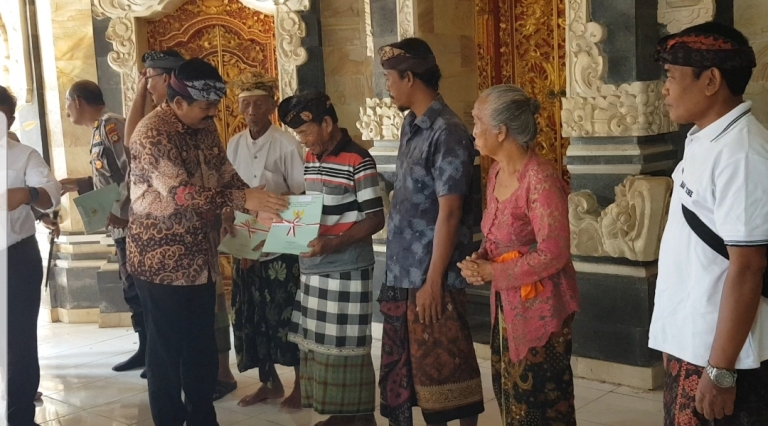 balitribune.co.id | Semarapura - Warga Klungkung patut bersyukur dengan kedatangan Menteri Agraria dan Tata Ruang/Kepala BPN Hadi Cahyanto ke Banjar Kawan, Desa Jumpai, Klungkung, Kamis (24/5/2023). Secara khusus kedatangan Menteri Hadi Cahyanto ini, untuk membagikan secara simbolis 12 Sertifikat tanah bagi perwakilan warga Klungkung dan unsur Kepolisian.