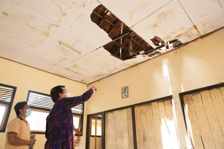 balitribune.co.id | Semarapura - Jebolnya atap ruang kelas SDN 1 Getakan,Kecamatan Banjarangkan, Klungkung rupanya mendapat perhatian dari orang nomor satu di Klungkung. Secara khusus Bupati Klungkung, I Nyoman Suwirta meninjau atap ruangan kelas yang mengalami jebol di SD Negeri 1 Getakan ini, Selasa (29/3/22).