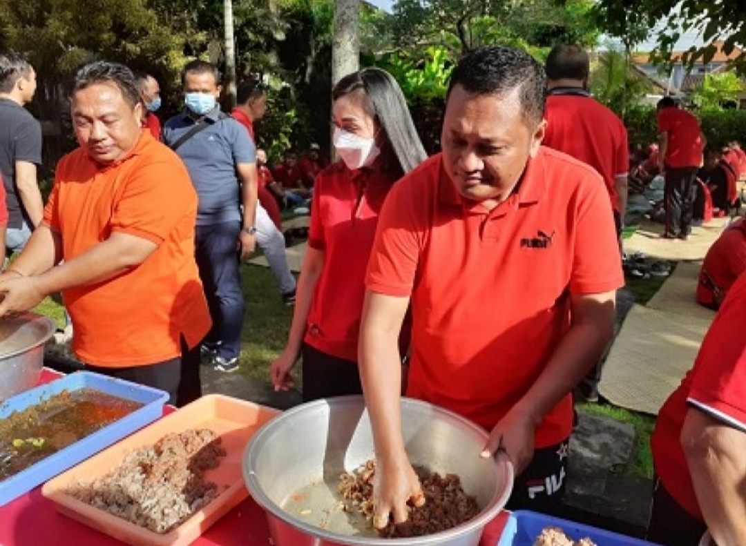 balitribune.co.id | Gianyar - Melalui kegiatan megibung atau makan bersama jelang tutup tahun 2021, Bupati Gianyar, I Made Mahayastra sekaligus meluncurkan aplikasi Gianyarku Aman di taman belakang kantor Bupati, Senin (27/12).