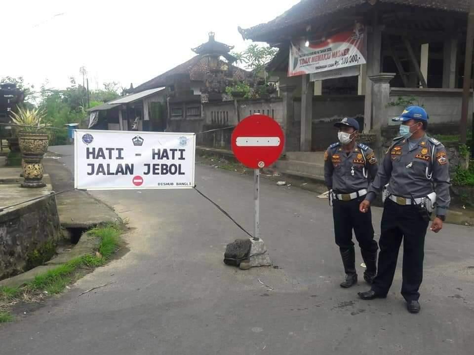 balitribune.co.id | Bangli- Dinas Perhubungan (Dishub) Kabupaten Bangli memasang spanduk di sejumlah lokasi jalan jebol, untuk mengingatkan penggunaan jalan lebih berhati-hati dikarena ada jalan jebol.