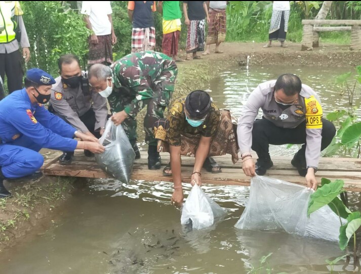 balitribune.co.id | Gianyar - Guna mewujudkan Desa Bukian, Payangan, Gianyar menjadi Desa Tangguh Dewata sesuai dengan program Kapolri, Kapolres Gianyar, AKBP I Dewa Made Adnyana didampingi Kapolsek Payangan, AKP I Made Tama dan masyarakat menggelar kegiatan penebaran 4.500 ekor benih ikan jenis nila.