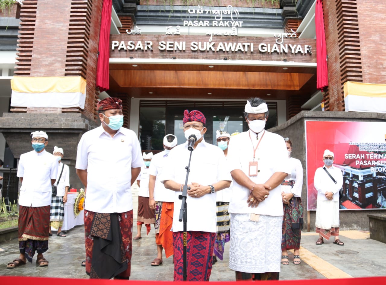 balitribune.co.id | Gianyar – Gubernur Bali, Wayan Koster meresmikan dan menjadi saksi diserahterimakannya Bangunan Pasar Seni Sukawati Blok A dan Blok B dari Kementerian Pekerjaan Umum dan Perumahan Rakyat RI, melalui Kepala Balai Prasarana Permukiman Wilayah Bali, I Nyoman Sutresna, ST kepada Pemerintah Kabupaten Gianyar, me