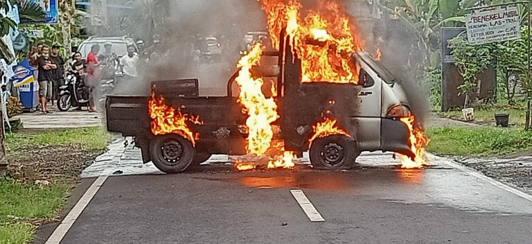 balitribune.co.id | Tabanan - Diduga karena korsleting, mobil pick up warna putih DK 8478 MG terbakar di Jalan Raya Juruan Penebel-Tabanan, tepatnya di perbatasan Desa Pitra dengan Desa Buruan, termasuk Banjar Dinas Buruan Kaja, Desa Buruan, Kecamatan Penebel, Rabu (11/11) sore.