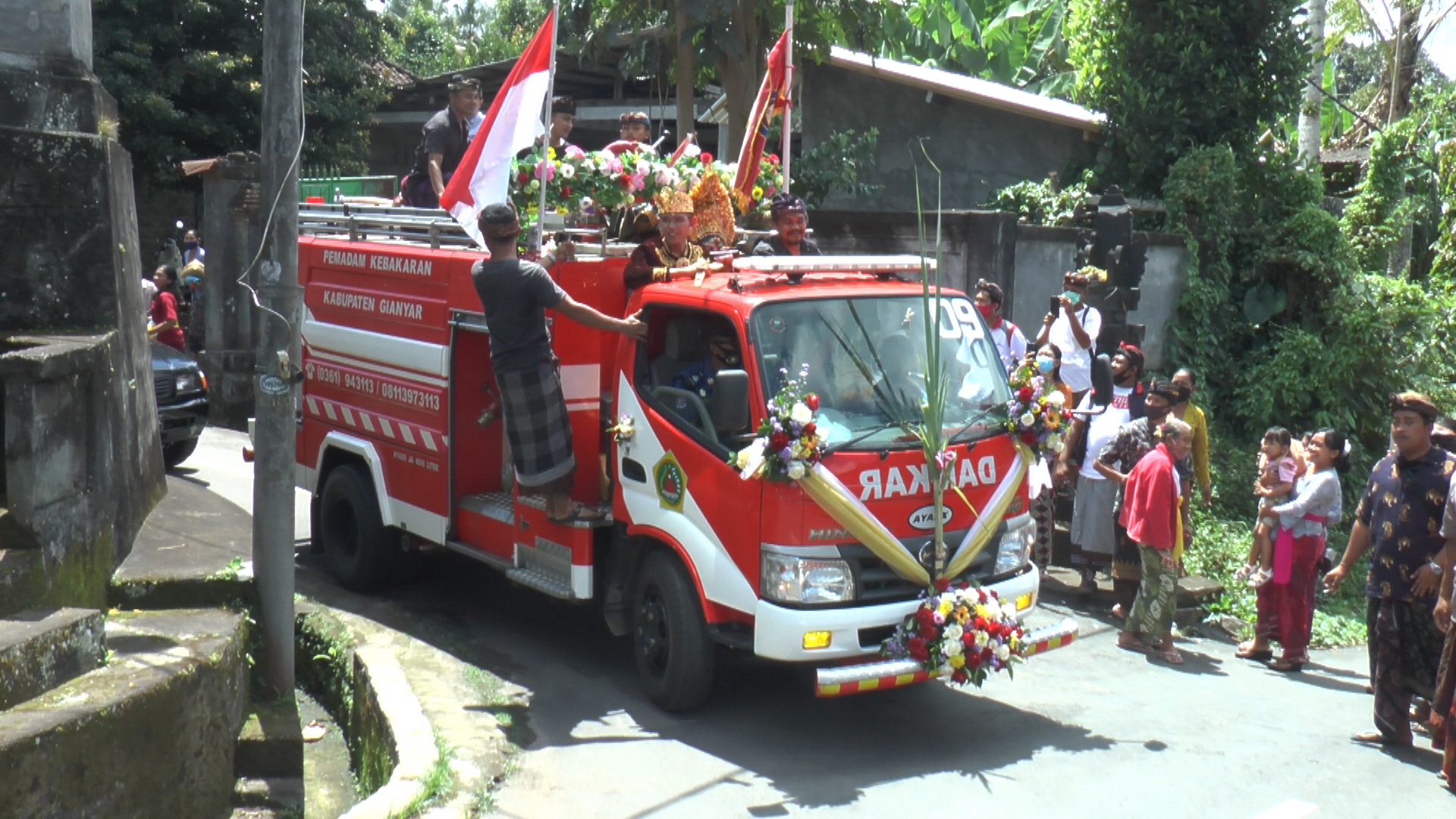 balitribune.co.id | Gianyar - Suasana hari perkawinan pasangan Pande Nyoman Wiranata dan dan Ni Made Dwi Widyastuti di Desa Petak Kaja, Gianyar, Sabtu (5/9) benar-benar penuh kejutan. Disaat prosesi akan dimulai, undangan dikejutkan dengan kedatangan satu unit mobil pemadam kebakaran, lengkap dengan personilnya.