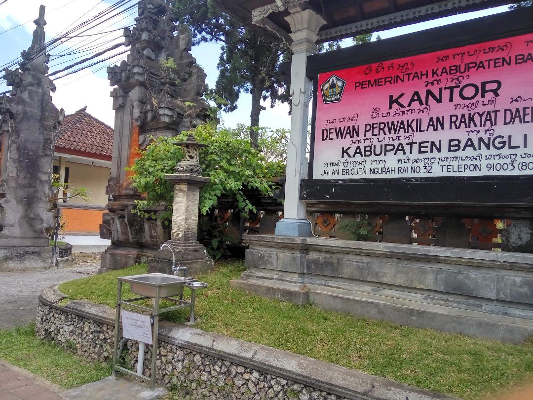 Balitribune.co.id | Bangli - Pemasangan tempat cuci tangan lengkap dengan sabun dilakukan sebagai upaya pencegahan penyebaran virus corona (Covid-19). Tempat cuci tangan dipasang di beberapa tempat fasiltas umum dan depan perkantoran.