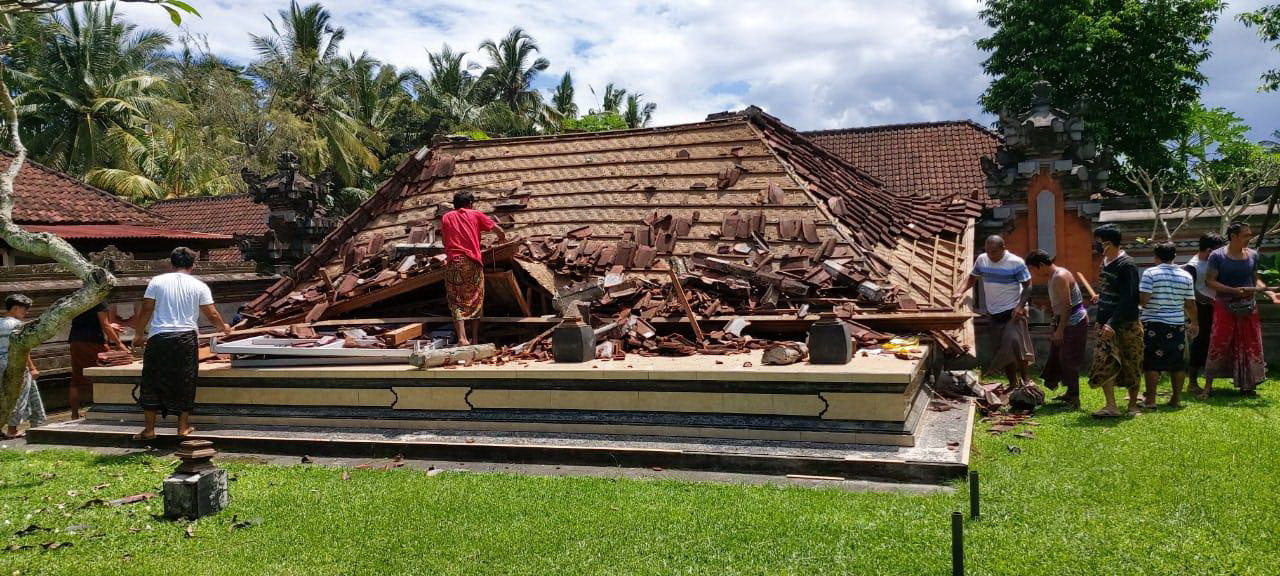 balitribune.co.id | Gianyar - Di tengah Wabah Covid 19 menghantui, bencana alam juga turut menyambangi. Pura Dalem Alit, Banjar Baung, Desa Sayan, Ubud, sebuah bangunan Bale Pesantian didapati ambruk setelah diterjang angin ngelinus. Meski tidak ada korban jiwa, namun kerugian yang akibatkan kejadian ini mencapai Rp 450 juta.