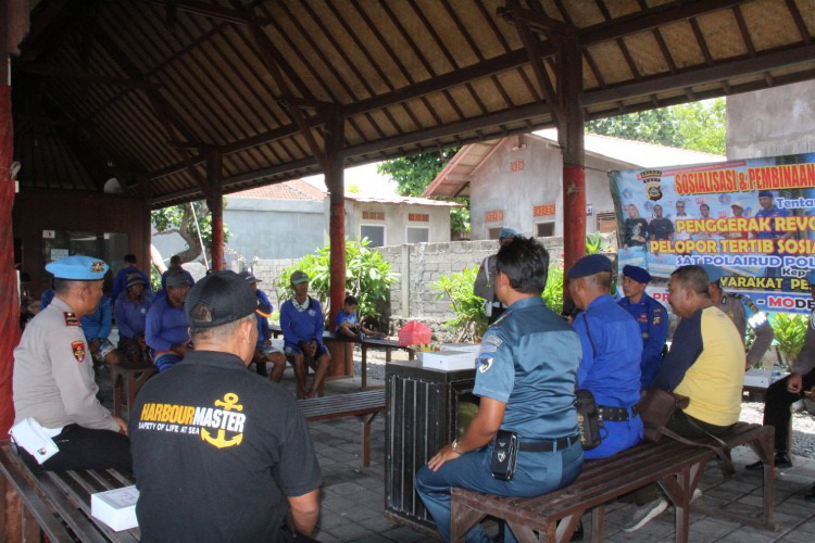 balitribune.co.id | Semarapura - Sat polairud Polres Klungkung melaksanakan program Quick wins Polri, Polisi sebagai penggerak revolusi mental dan pelopor tertib sosial di ruang publik dengan Masyarakat Pesisir pantai Pantai Tribuana Desa Kusamba, Kecamatan Dawan, Kabupaten klungkung dengan kelompok buruh sorog tribuana, Jumat (7/2/2020) lalu.