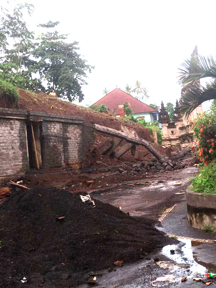 BALI TRIBUNE - Projek pembangunan senderan sepanjang 100 meter dengan tinggi mencapai 6 meter di Pura Samuan Tiga, Bedulu Gianyar masih dalam tahap pengerjaan. Akibat guyuran hujan seharian penuh yang melanda kawasan itu, struktur tanah yang ada di lokai projek dimaksud tergerus.