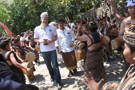 BALI TRIBUNE - Puluhan Delegasi IMF World Bank Grup yang dipimpin oleh Knowledge Sharing and Learning Global Practice for Social, Urban, Rural and Resilience, Steffen Soulejman Janus mengunjungi Tukad Bindu, Denpasar, Selasa (16/10). Kehadiran delegasi IMF tersebut disambut gemuruh puluhan Kendang Adi Mardangga.