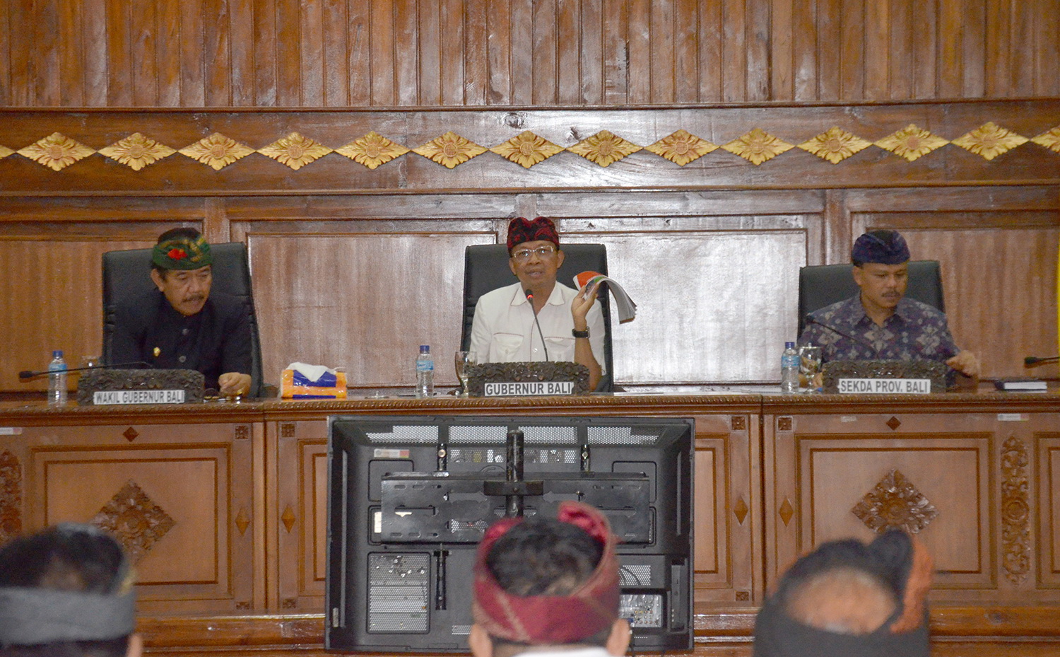 BALI TRIBUNE - Gubernur Bali Wayan Koster didampingi Wakil Gubernur Bali Tjokorda Oka Artha Ardhana Sukawati (Cok Ace) dan Sekretaris Daerah Provinsi Bali Dewa Made Indra memimpin pertemuan yang diikuti Kelompok Ahli Provinsi Bali dan seluruh Kepala OPD Pemerintah Provinsi Bali di Gedung Wiswa Sabha Utama, Kantor Gubernur Bali, Kamis (25/10). Dalam pengarahannya, Gubernur Wayan Koster meminta kelompok ahli dan kepala OPD menyamakan ‘gelombang’ untuk mewujudkan