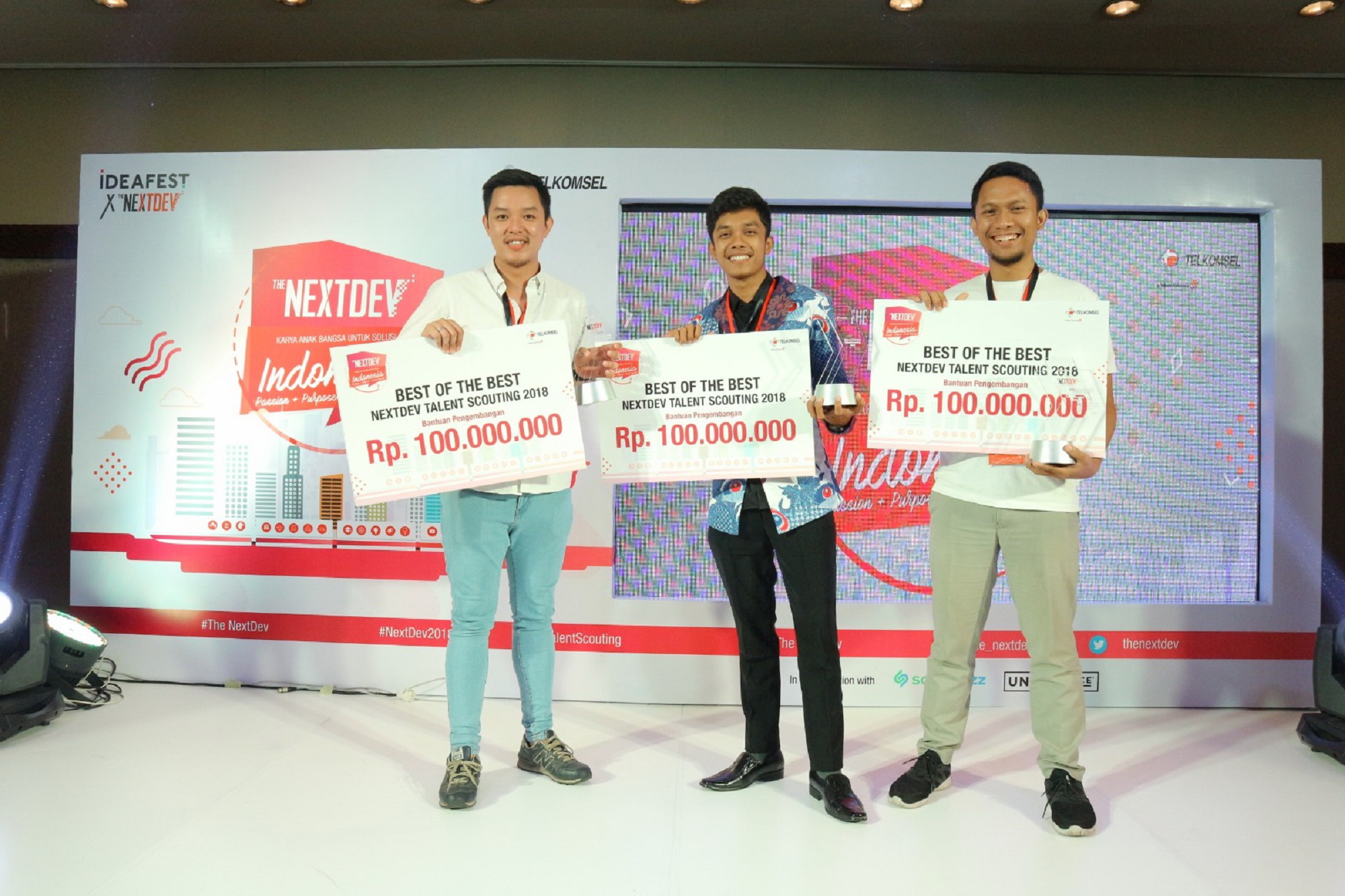 BALI TRIBUNE - Telkomsel The NextDev 2018, kompetisi yang mendorong anak muda Indonesia untuk berkarya lewat teknologi, telah sampai pada puncaknya. Setelah melewati berbagai tahapan seleksi sejak bulan April 2018, Fishgo, Garda Pangan dan Hello Beauty akhirnya terpilih menjadi tiga pemenang yang diumumkan di ajang festival kreatif terbesar Indonesia, IdeaFest.