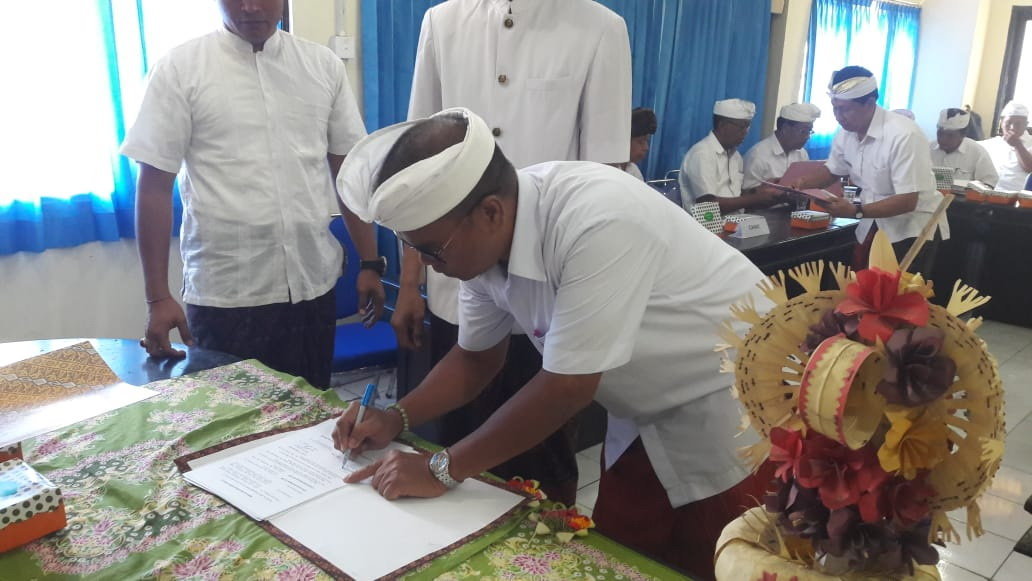 BALI TRIBUNE - Plt. Kepala Dinas Pemberdayaan Masyarakat dan Desa Kabupaten Gianyar I Dewa Gede Alit Mudiarta menyerahkan Surat Keputusan Bupati Gianyar tentang pemberhentian Perbekel dan Pengangkatan Aparatur Sipil Negara (ASN) sebagai Penjabat Perbekel (Pj), untuk menjalankan pemerintahan di desa.