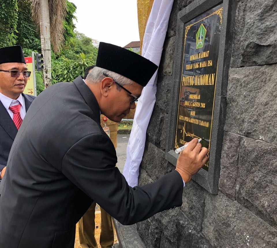 BALI TRIBUNE - Peresmian patung Hanoman yang telah selesai dibangun di depan Kantor DPRD Tabanan Jalan Gatot Subroto, Banja Anyar, Kediri, Tabanan ditandai dengan penandatangan oleh Ketua DPRD Tabanan I Ketut Boping Suryadi bertepatan dengan HUR RI ke-73, Jumat ( 17/8). Peresmian dilakukan dengan penuh kesederhanaan tanpa serimonial itu dilaksanakan sekitar pukul 11.00 Wita usai dilangsungkanya detik-detik Peringatah Hari Proklamasi HUT RI ke 73. Ketua D