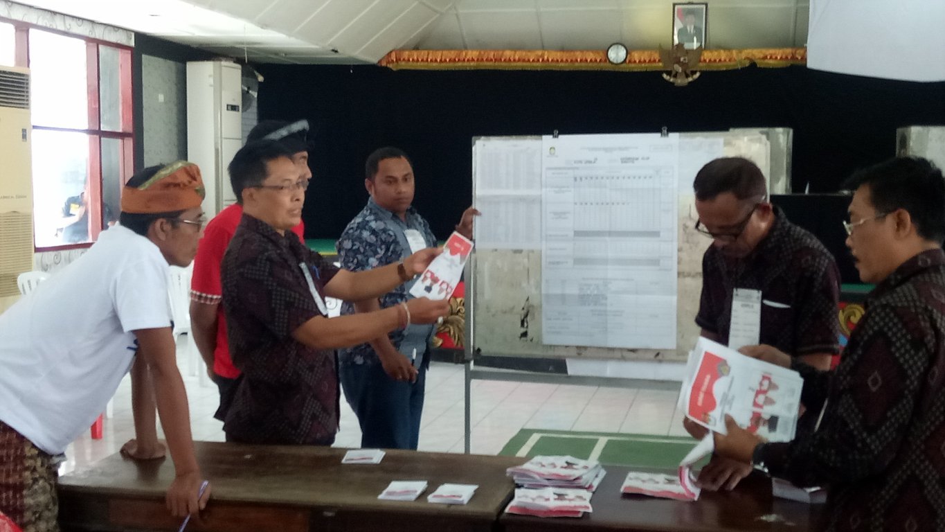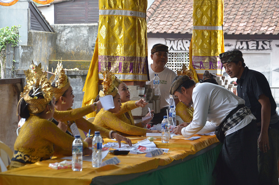 BALI TRIBUNE - Penari Tenun mewarnai Pemilihan Gubernur dan Wakil Gubernur (Pilgub) Bali di Tempat Pemungutan Suara (TPS) 8 Banjar Blungbang, Desa Penarungan, Kecamatan Mengwi, Badung. Di TPS ini, ibu-ibu panitia pemungut suara (PPS) kompak mengenakan pakaian penari tenun selama proses pencoblosan. Sedangkan petugas yang laki-laki mengenakan pakaian adat.