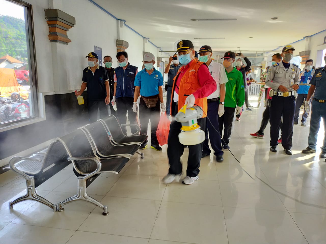 balitribune.co.id | Amlapura - Menindaklanjuti himbauan Pemprov Bali tentang penyemprotan desinfektan serentak, Pemkab Karangasem melakukan penyemprotan dengan mengerahkan seluruh Kepala OPD bersama para stafnya, Sabtu (21/3/2020). Dengan membagi tugas,Wakil Bupati Karangasem memimpin penyemprotan di pelabuhan Padang Bay dan Pasar Ulakan.