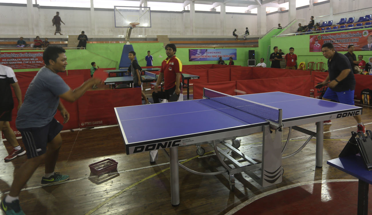 BALI TRIBUNE - Pengkab Persatuan Tenis Meja Seluruh Indonesia (PTMSI) Gianyar menyelenggarakan Kejuaraan Tenis Meja Bupati Gianyar Cup II se-Bali, Kamis (25/10) di GOR Kebo Iwa Gianyar.  Kejuaraan dibuka Wakil Bupati Gianyar, Anak Agung Gde Mayun, dan berlangsung mulai 25-28 Oktober 2018. Kapolda Bali Irjen Petrus Reinhard Golose menyempatkan hadir dan meninjau langsung bahkan ikut bermain kejuaraan tenis meja Bupati Gianyar Cup II se-Bali.