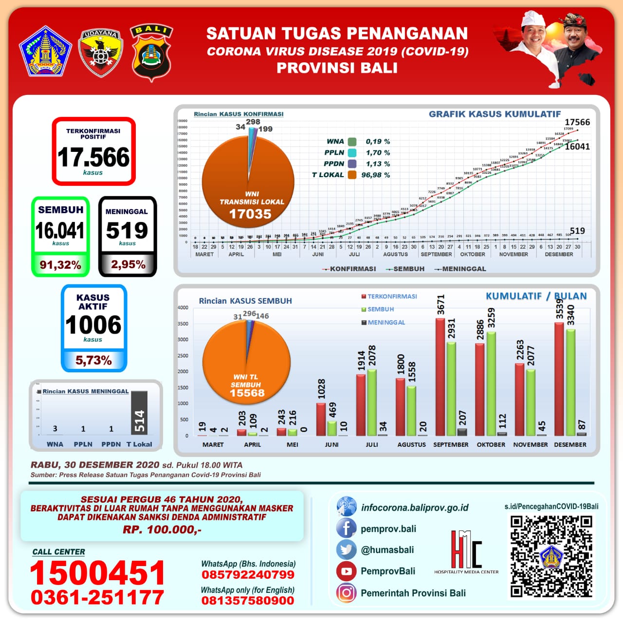 Balitribune.co.id | Denpasar - Perkembangan kasus pandemi Covid-19 yang dilaporkan pada Rabu (30/12) di Provinsi Bali, masih mencatat peningkatan kasus pasien positif yang melonjak tinggi.